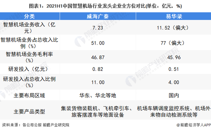 智慧机场行业在我国利好政策的带动下逐渐布局完善。目前中国智慧机场行业的龙头企业主要包括川大智胜、易华录、威海广泰等。从营业收入和毛利率的角度来看,易华录的营收表现较好但毛利率较威海广泰低;从业务布局区域来看,两家公司均主要布局国内业务。从研发投入及占比来看,威海广泰研发投入力度强。从主要产品布局来看,威海广泰主要集中于空港地面设备业务,易华录则专注于各类智慧机场系统业务。具体数据如下: