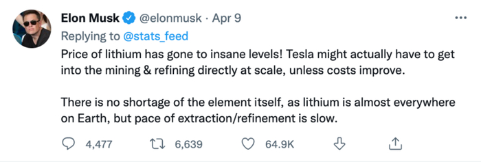 成本管理大师马斯克,也被锂金属价格上涨逼到墙角,不得不选择自己挖矿了。