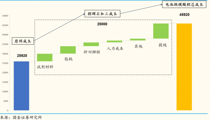 就拿电池级碳酸锂来说,根据国金证券测算,假设锂辉石精矿价格3240元/吨,8吨锂辉石精矿对可以生产1吨电池级碳酸锂,对应原料成本25920元/吨,锂辉石加工成本,包括人工、物料、折旧等支出,至少需要20000元/吨,综合锂辉石提锂生产1吨电池级碳酸锂成本为45920元/吨。