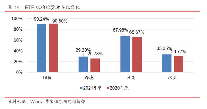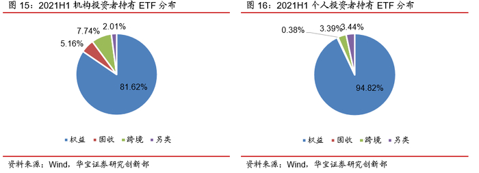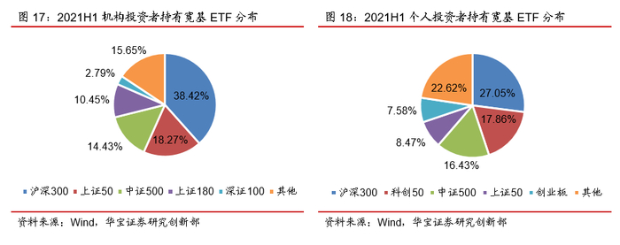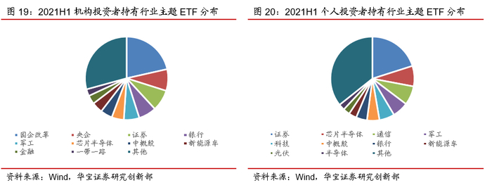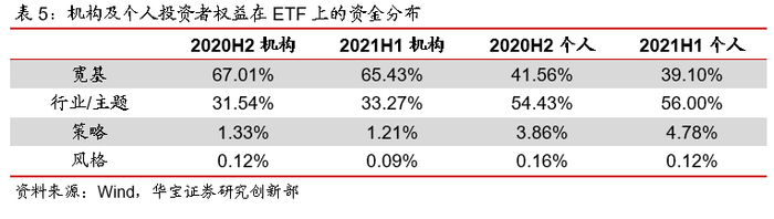 分投资者类别看,机构投资者与个人投资者分别有81.62%与94.82%的资金配置于权益ETF。而在权益ETF的具体配置上,机构投资者和个人投资者存在一定差异。机构持有的权益ETF以宽基为主,2021年中宽基的占比约为65.43%。而个人投资者的配置标的中行业主题基金的占比较高,2021年年中约为56.00%。同时,我们注意到,2021年中相较于2020年底,不论是机构投资者还是个人投资者,在行业主题基金上的资金分布均有所提升,或许与市场结构性行情特征有关。