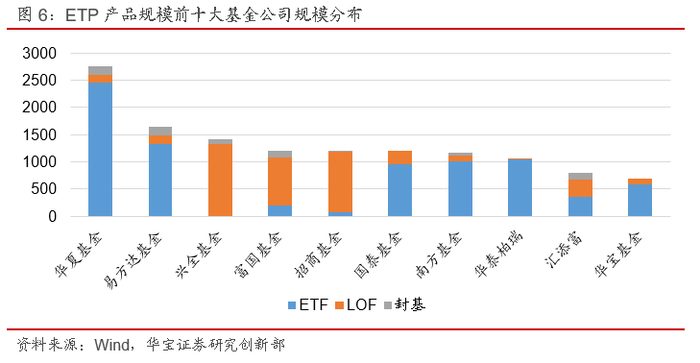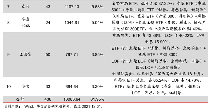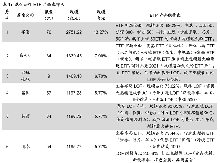 ETP规模前十大的基金公司在产品布局上各有特点,华夏及易方达的规模占比进一步提升,3-10家的排名较2020年有一定变化但总体稳定。