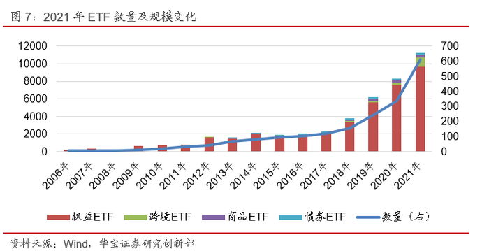 截至2021年底,公募市场共有603只非货ETF,总管理规模11252.89亿元,相较于2020年底的非货ETF数量和规模分别增长71.79%和32.50%,数量增速大幅增加,而规模增速有所放缓。