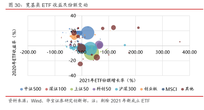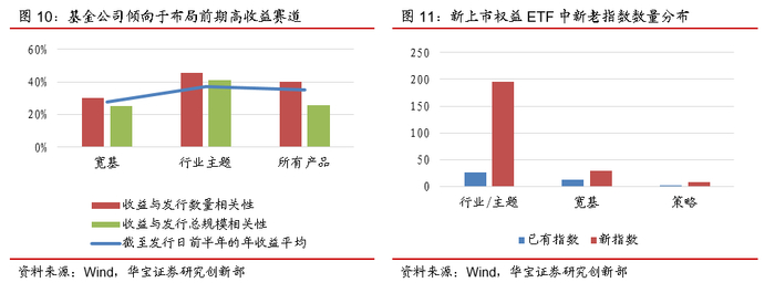基金公司在ETF的布局上,呈现出两个特点:(1)迎合市场需求,布局前期相对市场超额收益较明显的行业主题指数。考虑到基金从计划布局到正式发行需要经历一定的时间和流程,因此我们统计截至ETF所跟踪指数发行前半年的年度业绩(如某ETF于2021-6-30开始发行,则使用标的指数2020-1-1至2020-12-31的业绩作为业绩衡量指标),并计算这一业绩与该指数对应新发产品数量及规模的相关性。从结果来看,业绩与ETF的发行数量与业绩呈现正相关关系,且这一相关性在行业主题基金中体现得更为明显。(2)布局新指数,完善产品线:ETF的先发优势较为明显,因此在宽基指数上,基金公司往往选择新发指数或市场上布局较少的宽基指数推出相应ETF产品。一个较为典型的例子即MSCI中国A50互联互通对应的ETF,为2021年募集总规模最大的一类宽基ETF。