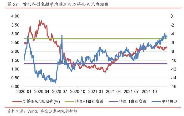 极端市场环境下,场内封基折溢价与A股的风险偏好密切相关。我们使用万得全A的风险溢价作为市场风险偏好的衡量指标,取11只科创主题基金折价的算术平均值,观察两者间的关系。可以观察,当万得全A的风险溢价围绕均值小幅波动时,对贴水影响不明显,而当风险溢价高于均值加一倍标准差或低于均值减一倍标准差时,则对场内封基的折溢价有明显的影响。举例来看,较为明显的是2020年4月,新冠疫情影响下市场风险偏好大幅下降,风险溢价快速上升,同时场内封基的折价明显扩大;2021年2月,在宽松的货币政策下市场经历了一年的上涨,风险溢价逐渐来到均值减一倍标准差的位置之下,此时的场内封基折价明显收敛。