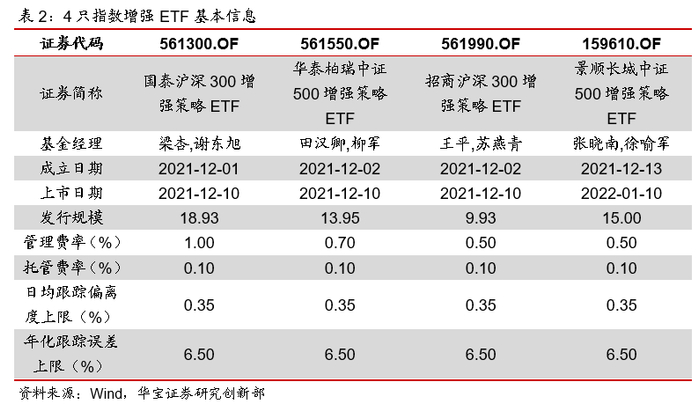 2021年12月,首批4只指数增强ETF发行,其中3只于12月10日同步上市。指数增强型ETF将主动化管理与ETF运作模式相结合,其投资目标与传统指数增强基金类似,即战胜标的指数并获得超额收益;而在运作方式上则与ETF相同,可在一级市场采用实物申赎,亦可在二级市场上市交易从而方便投资者参与。本次发行的增强型ETF费率低于场外的指数增强基金,但略高于一般ETF。本次的4只产品均采用了双基金经理制,两位基金经理分别负责指数增强和ETF运作。
