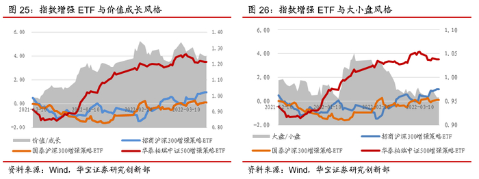 结合市场风格切换,我们尝试识别3只指数增强ETF在风格上的超额暴露。价值成长维度上,观察的3个月时间内,整体上价值风格相对于成长风格走强,结合产品走势,华泰柏瑞的500增强ETF与价值风格的超额收益有强的相关性,意味着在价值风格上有超额暴露,但两只沪深300的产品与价值成长的风格走势相关性不高,意味着在价值成长维度上的风格偏离不明显。在大小盘维度上,招商的300增强ETF与大小盘强弱的相关性稍高,相对在小盘上的偏离较多,因此在市场大盘风格走强时超额下降,另外两只产品与大小盘的强弱则没有显著关系。