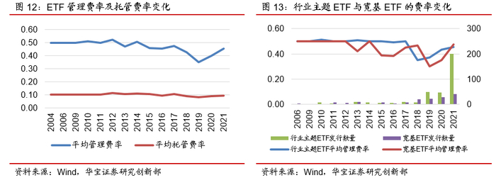 另一方面,与基金公司所处的竞争阶段有关。纵向来看,不论是宽基ETF还是行业主题ETF平均管理费率在2019年后均有明显的上升。2019年为ETF竞争白热化的年份,2019年 3月新入局 ETF 战场的平安创业板 ETF 在发行时以 0.15%/年的管理费和 0.05%/年的托管费打破行业管理费+托管费平均 0.6%/年的收费惯例,随后易方达、华泰柏瑞、嘉实等多家公司先后对旗下中证 500、沪深 300 指数相关的部分 ETF 产品进行降费,引发 ETF行业降费潮。在2020年的ETP年报中,我们曾对降费是否有助于ETF规模扩张展开分析,从结果来看,无论是从基金份额的绝对变动水平还是相对变动水平来看,均未体现出明显的超额的份额增长,意味着降费对规模的推动效果较为有限。或许是降费的效果不佳,后续发行的ETF费率重新上市回到接近2017年的费率水平。