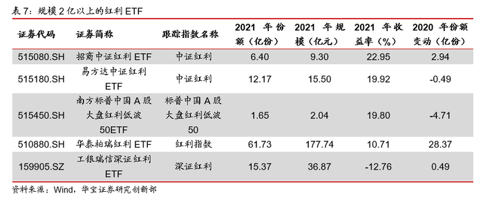 在策略类ETF中,红利成为布局最多的ETF产品。截至2021年底规模在2亿以上的产品,涉及红利策略的产品共有11只,其中纯红利策略的有7只,红利加低波策略的有4只,我们寻找其中规模在2亿以上的产品展开进一步分析。