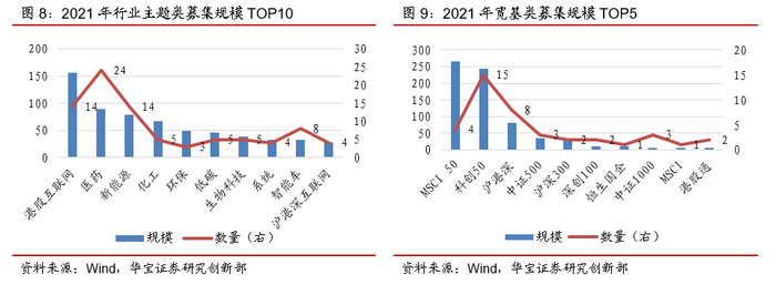 细分行业主题类ETF继续成为各大基金管理人的布局焦点。进一步对ETF发行数据进行分析可以发现,2021年延续之前的ETF发展趋势,继续围绕细分行业主题进行布局。截至2021年,全市场共有542只权益ETF,规模合计9709.60亿元;其中行业主题类权益ETF共357只,规模合计4693.18亿元,数量及规模占比分别为65.87%和48.33%。在2021年新发的281只权益ETF中,229只为行业主题型ETF,合计募集1155.41亿元,占新发权益ETF总规模的61.09%。具体来看,2021年的细分行业主题主要围绕港股互联网、医药、新能源、化工、环保等展开,其中,募集规模最大的为港股互联网,发行时间多集中在2021年5-6月,而发行数量最多的为医药主题。在宽基上,募集规模最大的为MSCI中国A50指数,发行数量最多的为科创50指数。