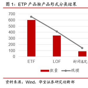 按产品形式,ETP可分为:ETF、LOF、封闭&定开基金。截至2021年底,市场上共有:603只ETF,规模11252.89亿元;349只LOF,规模7099.15亿元;88只封闭基金,规模2387.90亿元。