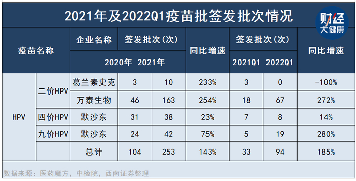 2022年的批签发量仍在增加。据华西证券3月的一份研报,根据中检院披露数据,截至2022年3月15日,四价HPV疫苗批签发12批次,推测约为200-250万支;九价HPV疫苗批签发20批次,推测约为400-450万支。预计2022年第一季度四价和九价整体批签发约600-799万支,同比去年增长100%-130%。