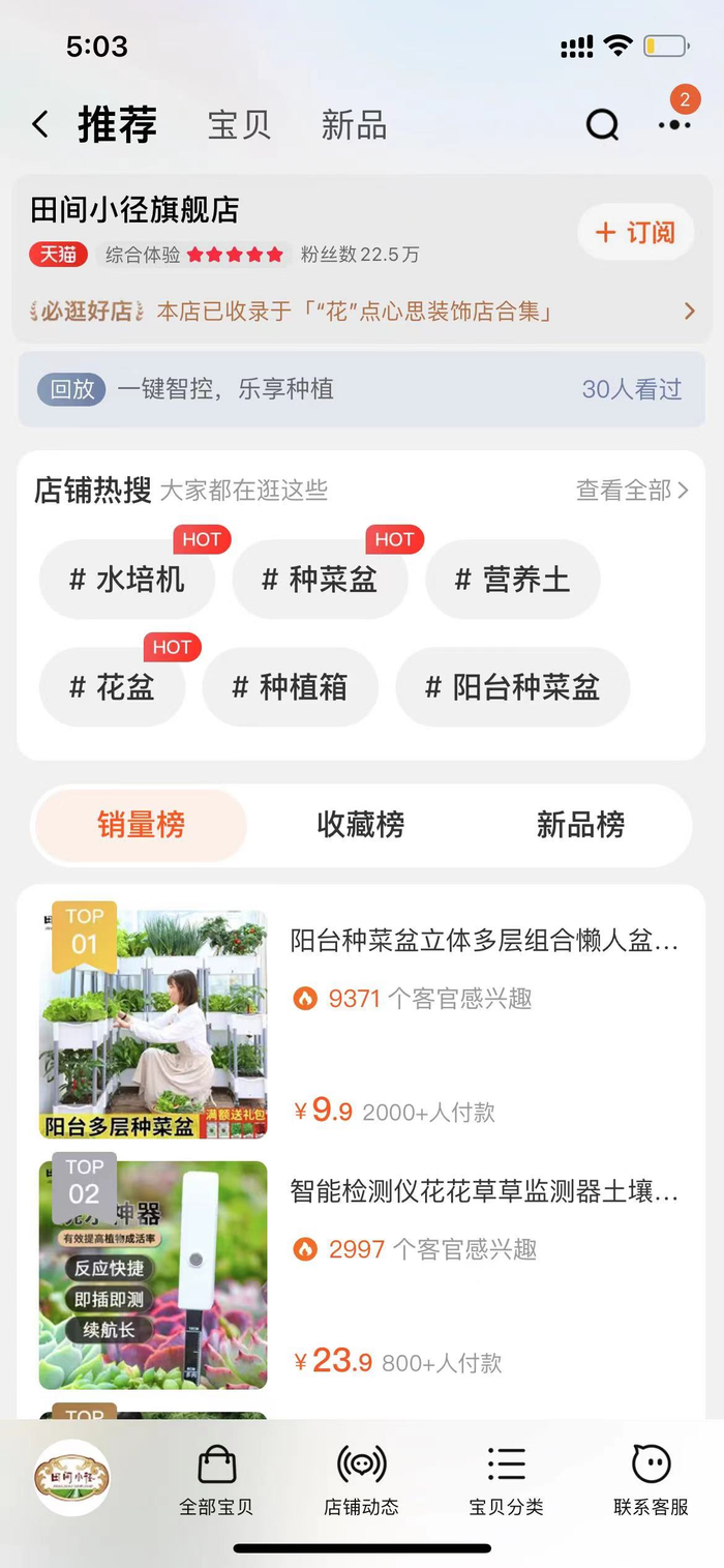 田间小径店铺经营了很多年,此前主要经营绿植花卉盆栽,店铺粉丝已有20多万。最近一个月他们上架了一款大型室内智能种菜机,价格在1199-1799元之间,月销量将近40件。
