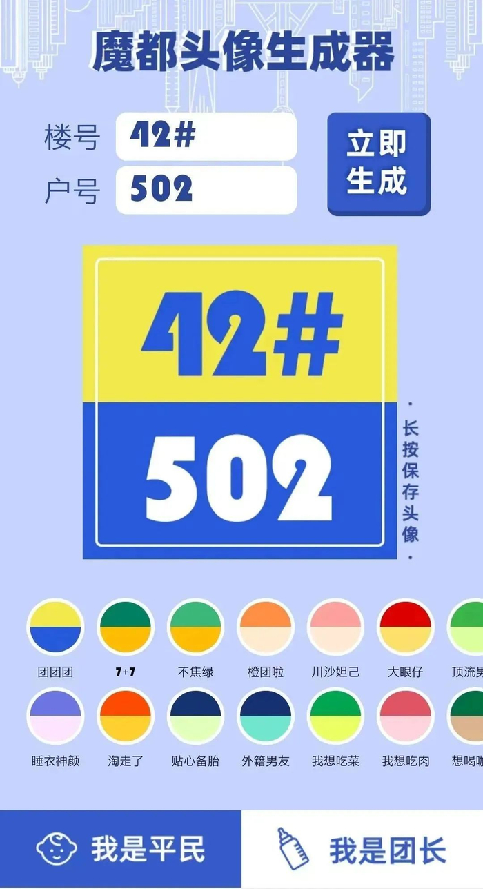 不难发现,头像生成器中每一个配色下的文案描述,大部分都是与疫情相关的网络流行梗。例如:“不焦绿”“橙团啦”“顶流男神”“开封菜”……