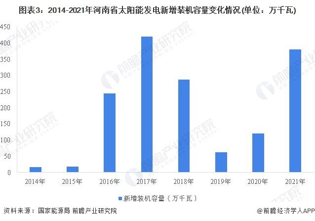 2014年以来,河南省太阳能新增装机容量波动明显,2016-2018年新增装机容量更是超过200万千瓦。随后受政策变化影响,2019年以来,河南省新增太阳能装机量下降至63万千瓦,2020年以来,随着河南省分布式太阳能建设的提速,太阳能发电新增装机持续提升,截至2021年,河南省新增装机容量为381万千瓦。