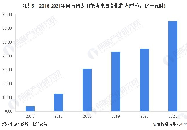 从电力生产来看,在太阳能发电方面,2016-2020年,河南省太阳能发电量高速增长,2016年全省太阳能发电量仅3.66亿千瓦时,到2021年增长至65.33亿千瓦时,总发电量在五年之内翻了近12倍。