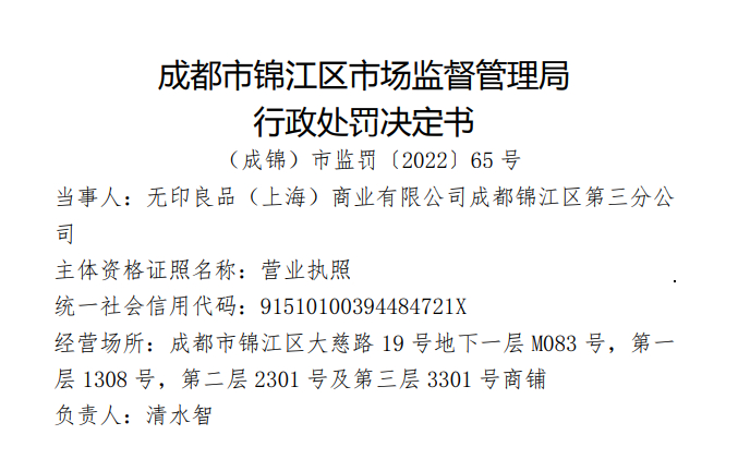 2020年10月28日,无印良品因“生产经营标注虚假生产日期、保质期或者超过保质期的食品、食品添加剂”被罚款5万元。
