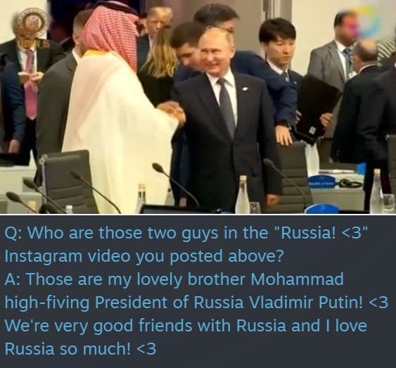 此外,结实各国政要更是如同家常便饭,由纪曾宣称自己受中国政府邀约,有机会前往中国参与于上海举办的Ti9;他还晒过自己近距离拍摄俄罗斯总统普京的视频,并表示与其握手的那位沙特人是自己的“好兄弟穆罕默德”。