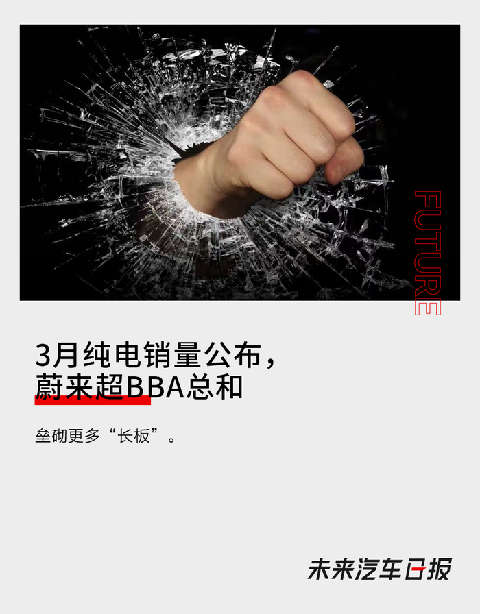 3月,根据中汽中心发布的数据,在30万元以上的高端纯电动市场,特斯拉之外,蔚来的销量也达9829辆,超过BBA总和,宝马、奔驰、奥迪销量分别为3123辆、1199辆和116辆。