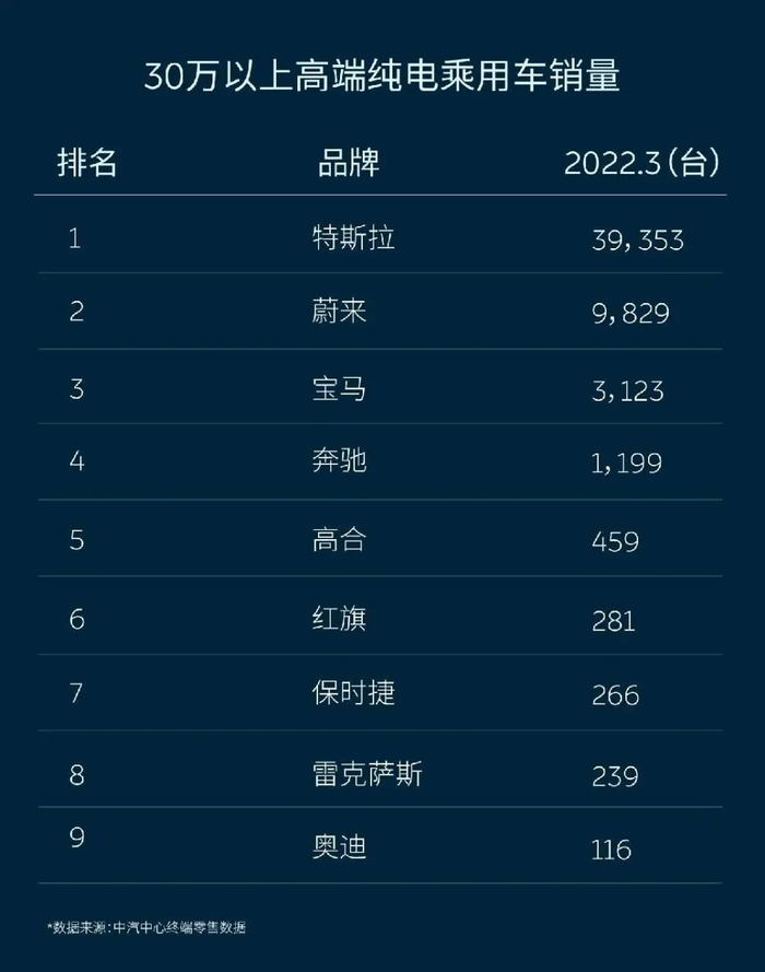 4月13日,根据中汽中心发布的终端零售数据,今年3月,在30万元以上的高端纯电动市场,蔚来销量达9829辆,宝马、奔驰、奥迪位列其后,销量分别为3123辆、1199辆和116辆。一个数字值得关注,蔚来一家的终端零售数据超过BBA三家总和。