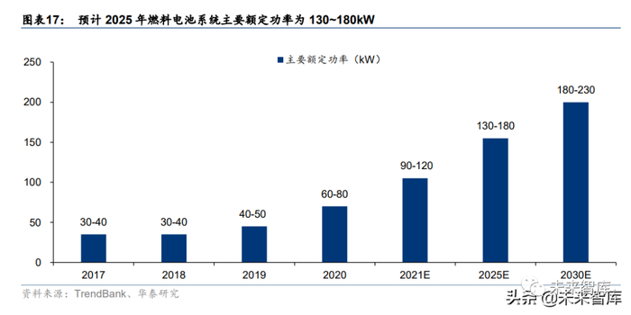 氢能在交通领域的应用将逐步向长续航、大载重的场景过渡。根据氢蓝时代常务副总裁曹 桂军在 2021 势银氢能与燃料电池产业年会上发表的《燃料电池系统开发与多场景应用》 的主题演讲,预计 2025 年燃料电池系统主要额定功率为 130~180kW,燃料电池系统最大 额定功率将大于 180kW,氢能在交通领域的应用将逐步向长续航、大载重的场景过渡。
