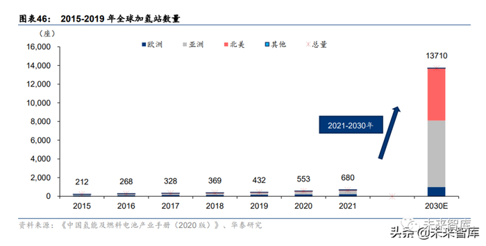 根据《中国氢能及燃料电池产业手册(2020 版)》,美国、欧洲、日本和韩国 2030 年分别 规划加氢站 5600 座,1000 座、1200 座和 900 座,预计 2030 年全球加氢站总数达 13710 座,2021-2030 年 CAGR=39%。