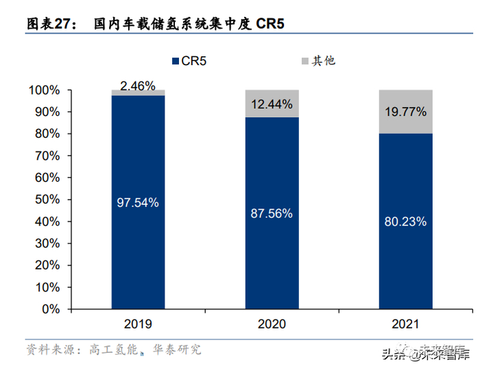 国内车载储氢系统市场格局从集中逐渐走向分散。国外 70MPa 氢气瓶研究起步较早,应 用相对成熟,主要机构包括挪威 HexagonComposites、美国 Quantum、日本丰田、韩国 ILJINComposite 等,目前产品以Ⅳ型瓶为主,储氢密度均在 5.0wt%左右。2021 年中国车 载储氢系统出货量前五企业集中度(CR5)为 80.23%,相较 2020 年下降 7.33pct,比 2019 年下降 17.31pct。2020~2021 年前三家分别为国富氢能、舜华新能源、科泰克。2019~2021 年国富氢能市占率从 43.7%下降到 37.9%,保持第一,逐年略有下降。