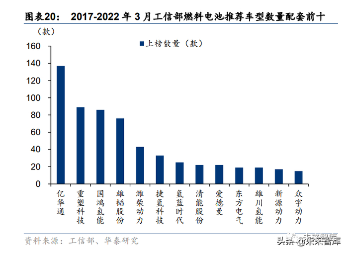 燃料电池系统:行业市场集中度维持高位,基于对政策和未来市场前景的良好预期,进入 的企业持续增加,市场集中度有下降趋势。2017 年~2022 年 3 月,工信部燃料电池推荐 车型数量累计配套燃料电池系统前三名分别为:亿华通、重塑科技、国鸿氢能,分别有 137、89、86 款燃料电池系统进入推荐车型数量配套。
