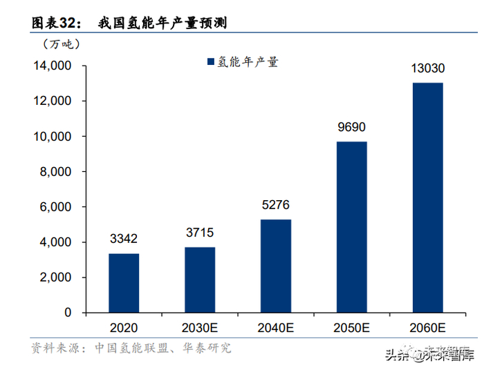 在 2030 年碳达峰愿景下,我 国氢气的年需求量预期达到 3715 万吨,在终端能源消费中占比约为 5%;在 2060 年碳中 和愿景下,我国氢气的年需求量将增至 1.3 亿吨左右,在终端能源消费中占比约为 20%。