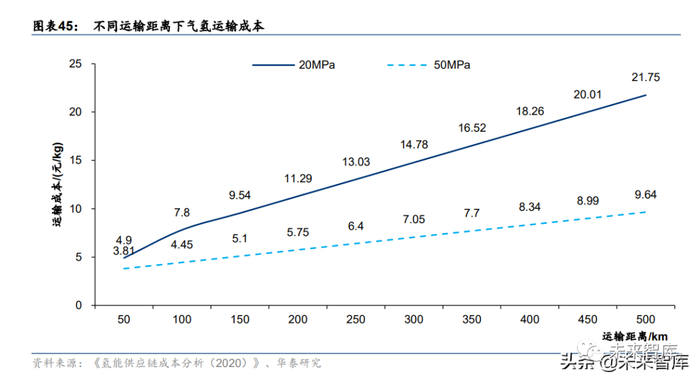 压力等级提升,可显著降低气态运氢成本,50MPa 长管拖车 500km 运输成本 9.64 元/kg 。 20MPa 长管拖车运氢一般适用于 200km 内的短距离和运量较少的运输场景,随着距离增 加,50MPa 下的成本优势越来越明显。从经济性角度出发,加大钢瓶储氢压力势在必行, 我们认为这将是未来高压气氢运输的发展方向。