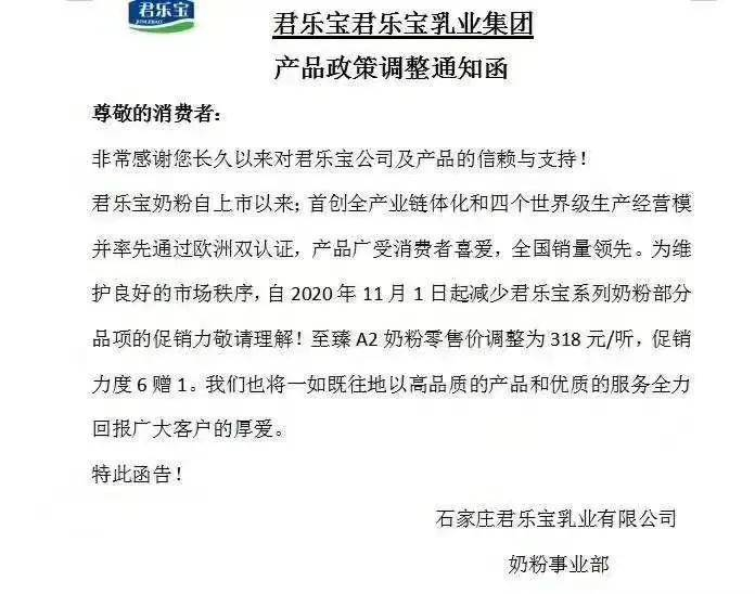 2020年,君乐宝旗帜益佳奶粉系列正式提价。君乐宝旗帜益佳400g规格全段奶粉执行最新价格138/罐,800g规格全段奶粉执行最新价格258元/罐。同年11月,有经销商接到通知称,君乐宝宣布减少君乐宝系列奶粉部分品项的促销力度,至臻A2奶粉零售价调整为318元/听,促销力度6赠1。