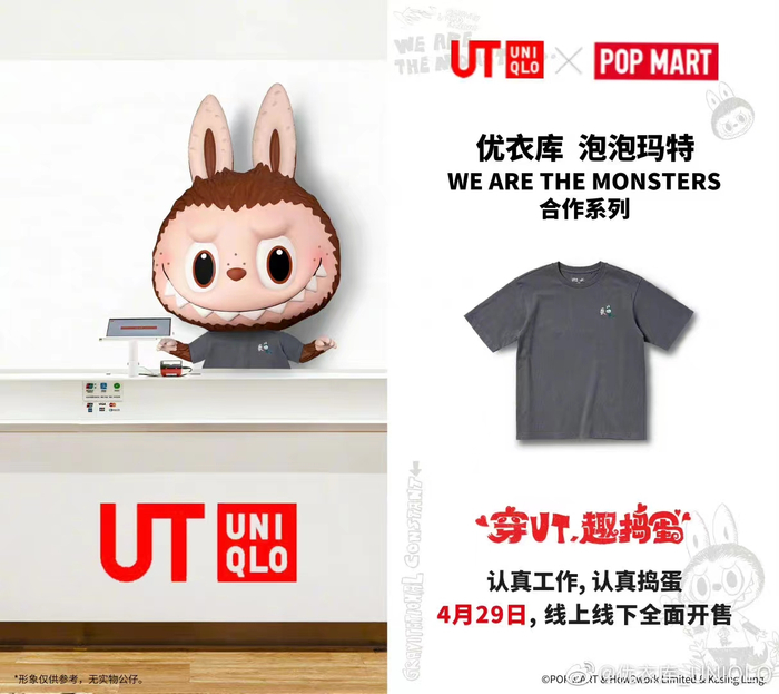 更值得关注的是,日前,优衣库首次与中国潮流文化品牌合作,将于4月29日发布与中国潮玩品牌泡泡玛特IP“LABUBU”推出联名系列UT,共发售四款成人装(定价99元)与四款童装(定价79元)。同时,泡泡玛特也推出优衣库联名限量礼赠。单笔订单购买任意Popmart系列满2件且该订单总金额超过588元,即可获得优衣库泡泡玛特联名限定礼盒,内含1只LABUBU限量手办。
