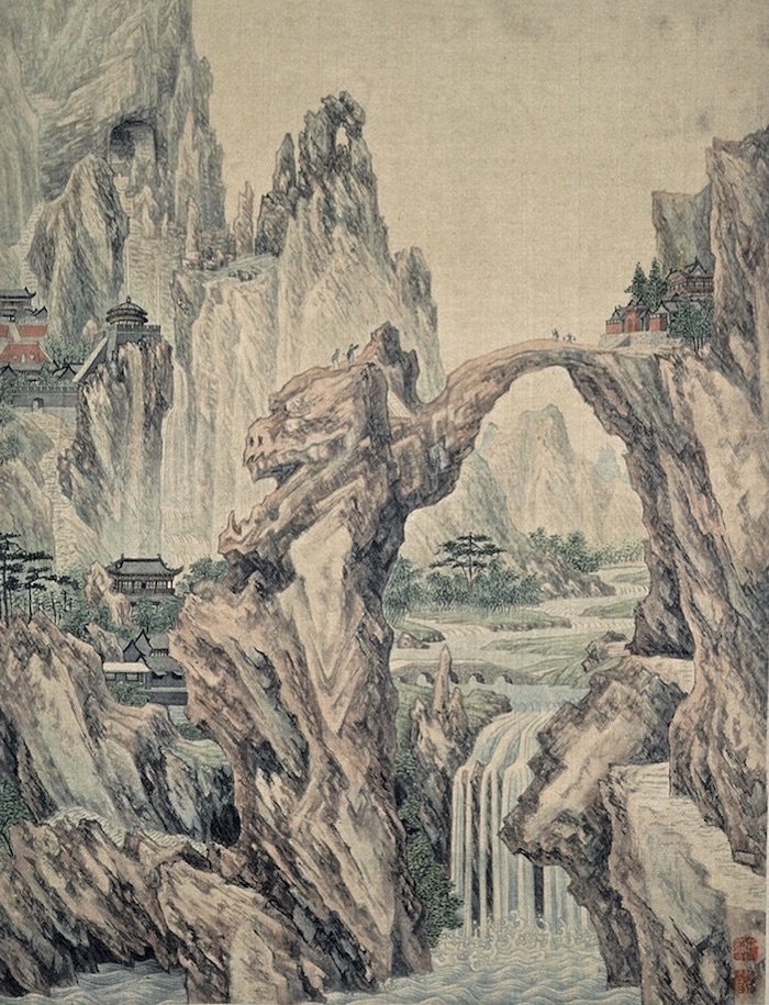 图5:释道存(石庄)册页,来自《天台八景》,1706 年,绢本设色,36.2 厘 米 ×28 厘米,苏富比拍卖图录(New York, June 1, 72) 亦见 Sotheby’s Hong Kong“, Fine Chinese Paintings from the Currier Collection,”May 1, 2000, no. 109。图册将作画时间定为1766年,将画家卒年定为1792 年