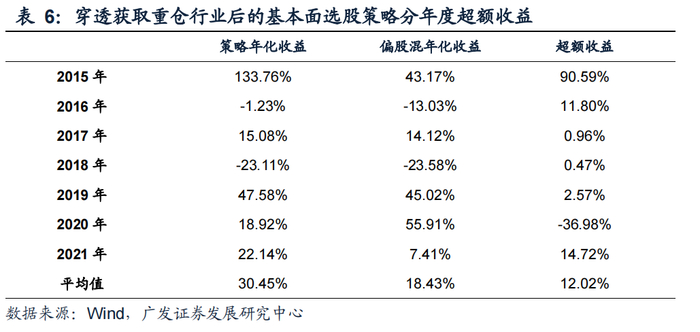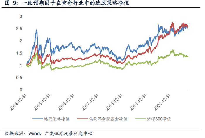 基于重仓行业配置的选股策略:在配置基金重仓行业可以相对基准获得一定超额收益的前提下,我们在所选重仓行业的成分股中进行基本面因子选股,构建组合管理策略,长期大幅跑赢偏股混合型基金指数和沪深300指数。分年度来看,只有2020年跑输了偏股混合型基金指数,为主动量化产品提供了新的思路。
