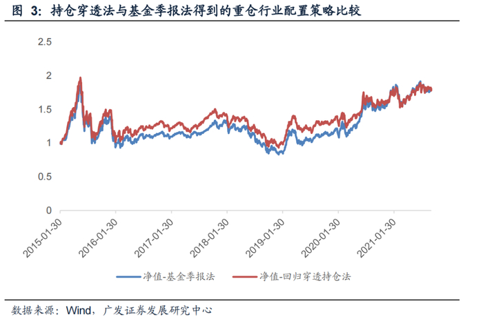 相较于根据基金前十大重仓股进行行业权重估算,可以看到通过数据回归方法穿透得到行业仓位估算,并进行重仓行业配置,整体业绩差别不大。但后者有三点优势,一是不存在数据延迟,二是相对基金季报数据统计没有那么繁冗,三是更为灵活,可以随时估算重仓行业。