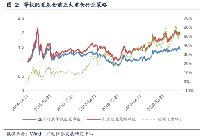 回归穿透配置重仓行业策略:类似的,还可以通过回归法穿透基金的风格配置。我们尝试采用6个巨潮风格指数进行回归测算,并在每个季度配置上季度前三大重仓风格,长期来看可以获得显著超额收益,但超额收益的稳定性不如行业配置策略。