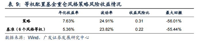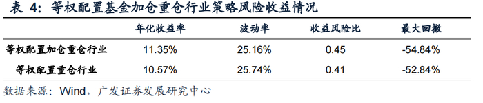 另外,我们发现等权配置相对上期加仓的重仓行业,相比直接等权配置重仓行业,又可以获得少量收益增量,不过这部分增量收益并不稳定。这里所谓加仓,是指回归系数相对上期有所上升的行业。同样以配置前五大加仓重仓行业为例,测算风险收益情况如下。