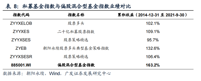如果能够找到业绩更好的基金指数,通过穿透持仓的方法,理论上来说可以获得市场表现更好的股票池。我们本希望尝试一下私募基金指数,但是通过对比公募基金指数与私募基金指数的长期业绩,发现目前的一些私募基金指数尚无法战胜偏股混合型基金指数,因此这一方面的尝试后续有待拓展。