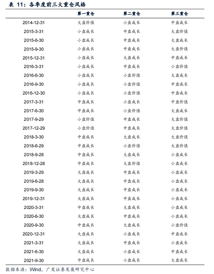 我们尝试采用巨潮风格指数进行季度频率的回归测算,统计偏股混合型基金指数在大盘价值、大盘成长、中盘价值、中盘成长、小盘价值、小盘成长六种风格上的仓位情况。