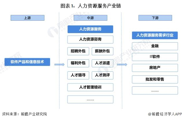 目前,人力资源服务产业链上游主要是给人力资源服务机构提供软件产品和信息技术的企业,下游则是各行业企业客户,视需求不同需要的服务类型也有所区别。