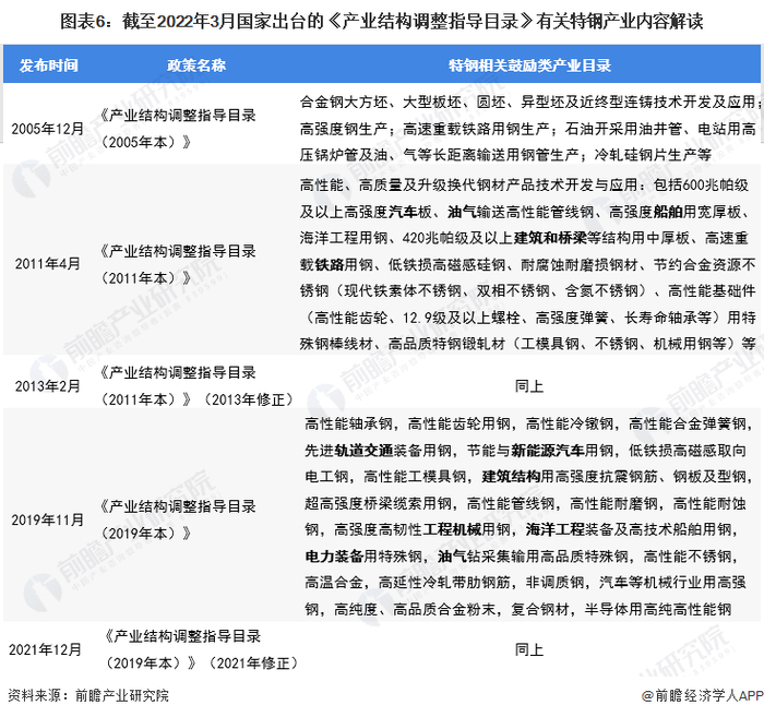特钢产业是钢铁行业的细分高新技术领域,也是国民经济发展的支柱性产业,国家层面高度关注特钢产业发展,历年的《产业结构调整指导目录》均对特钢相关产业做出具体的引导部署。