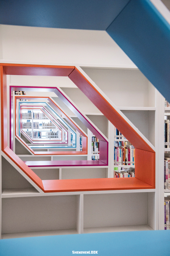 “竹林阅读区”座于通透的落地玻璃前,绿意盎然间可移步换景。彩色框架组成的镂空空间,可半躺式阅读,是馆内的隐藏打卡点。