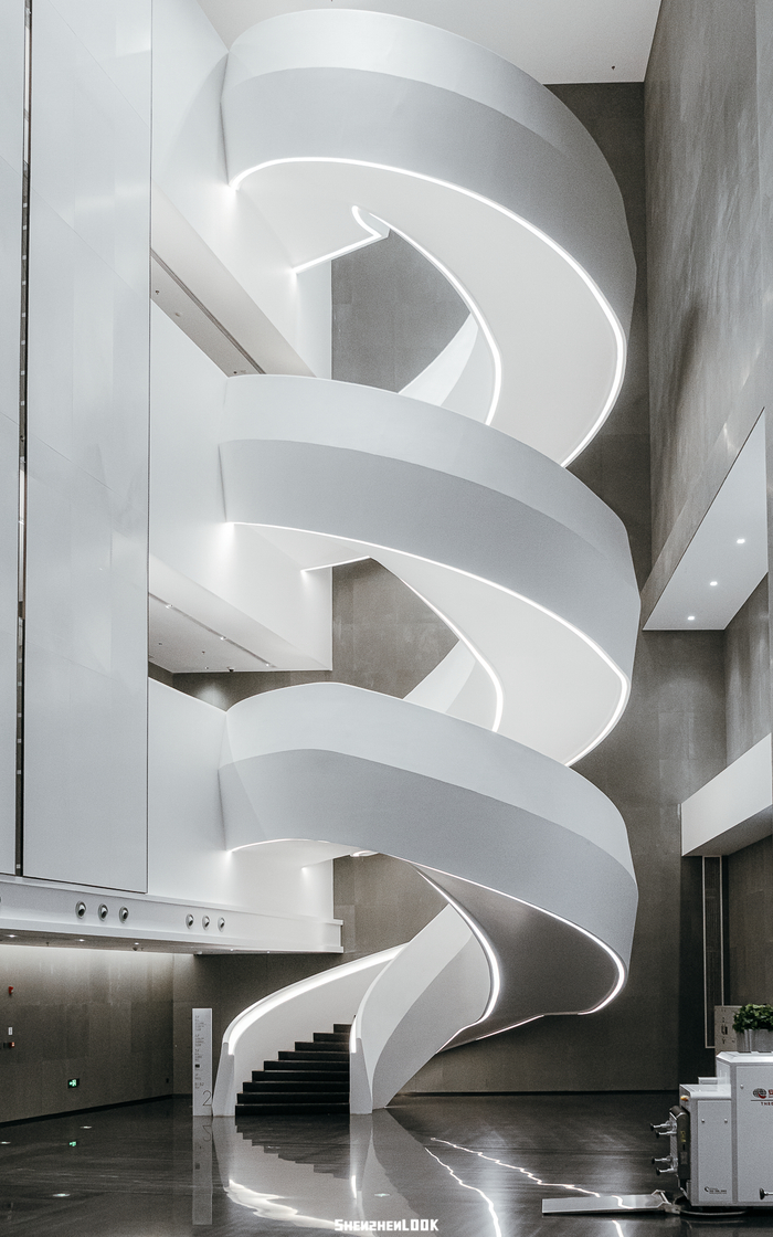 坪山图书馆,屹立于坪山文化聚落,40米高的建筑体螺旋而上,由知名建筑师董功设计。