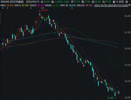 从股价走势来看,三环集团在去年12月见到阶段性高点47.39元/股,此后一路下跌幅度非常大,截至今年4月15日,三环集团报26.99元/股,较定增价格跌了31%左右。尽管阶段性浮亏比较大,但三环集团的限售股解禁是在今年6月17日,需要关注到时候的股价表现。