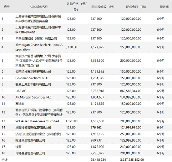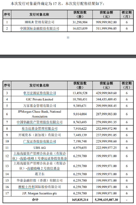 最终获配的有20名发行对象,包括高瓴旗下的HHLR管理有限公司,获配1787.54万股,获配金额近7亿元;基金圈大佬林利军掌舵的正心谷旗下有4只产品获配,合计获配1144万股,获配金额为4.48亿元;此外华夏基金、财通基金、诺德基金等也都获配了。这些定增股份的锁定期是6个月。