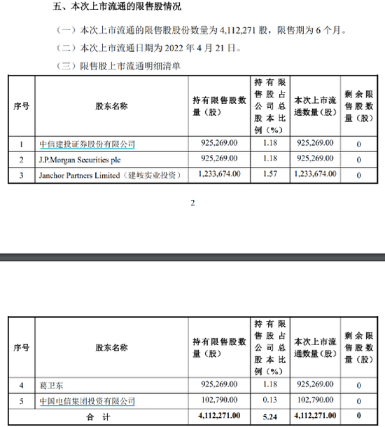 4月12日晚间安恒信息发布《向特定对象发行限售股上市流通公告》,公司在今年4月21日将有411.2万股限售股解禁,占总股本的5.24%。本次上市流通的限售股为公司向特定对象发行股票形成,涉及发行对象为5名,包括中信建投证券、JP摩根、葛卫东等。