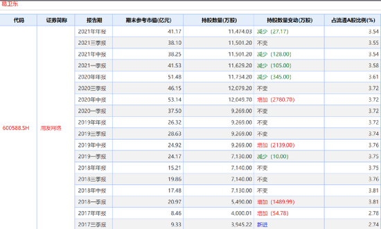 私募大佬葛卫东继续现身用友网络前十大流通股东名单,年报显示,到2021年四季度末,混沌投资董事长葛卫东仍然持有该公司1.15亿股,但是较三季度末减持了27.17万股,其期末持股市值为41.17亿元,位列第五大流通股东。