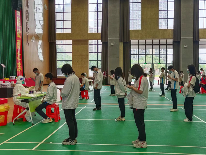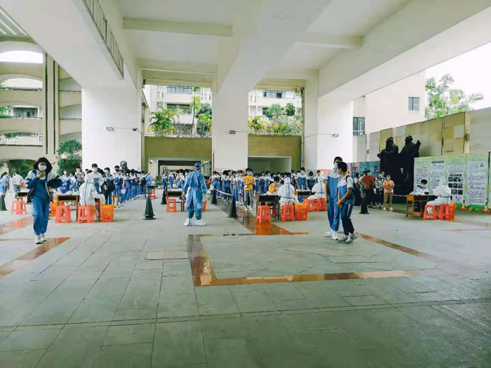 4月15日早上9点多,佛山华英中学的学生们按照指引安排统一回学校做核酸检测,为复课疫情防控做好准备。