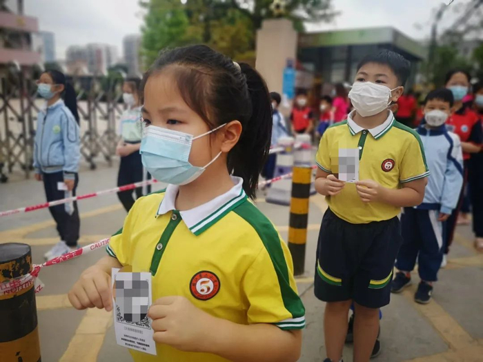 4月16日早上9点,禅城区环湖小学组织学生回校有序测核酸。