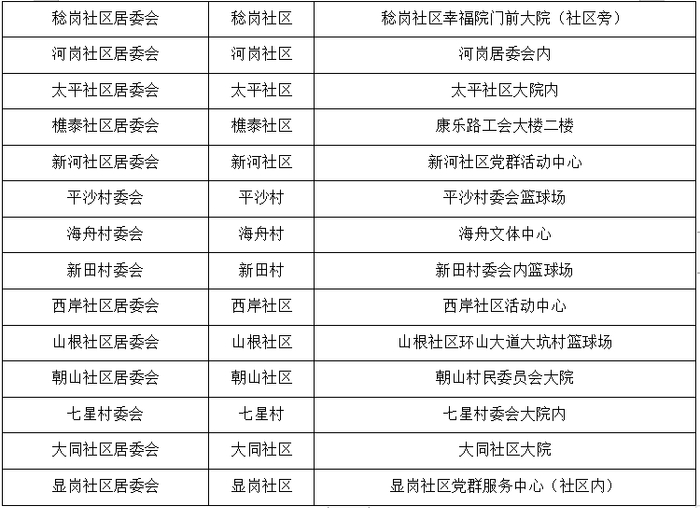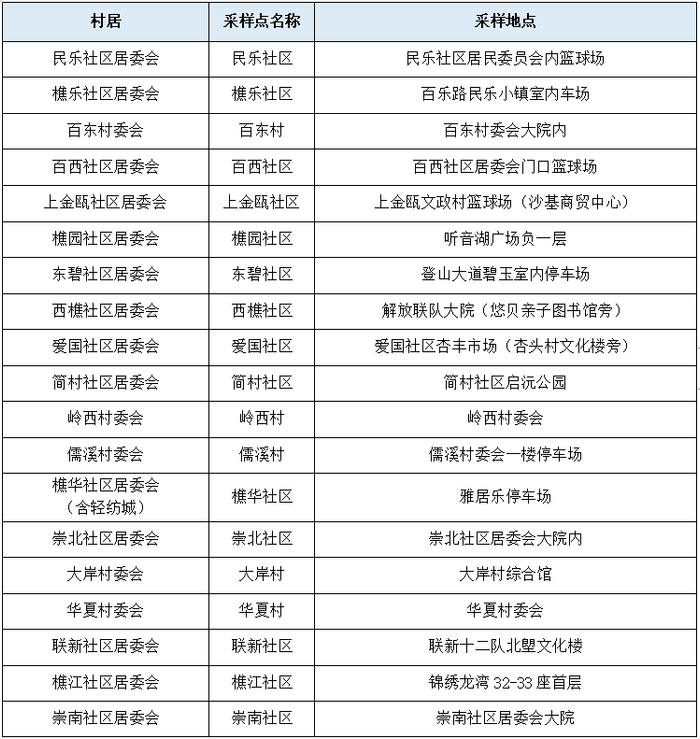 (二)检测地点:上西长龄文化楼、上东社区篮球场、沙口党群服务中心、梅圳梅东二球场、外滩公园、西桥奉思小学原址、水南龙一文化楼、河清卫生站、南金德兴文化楼。