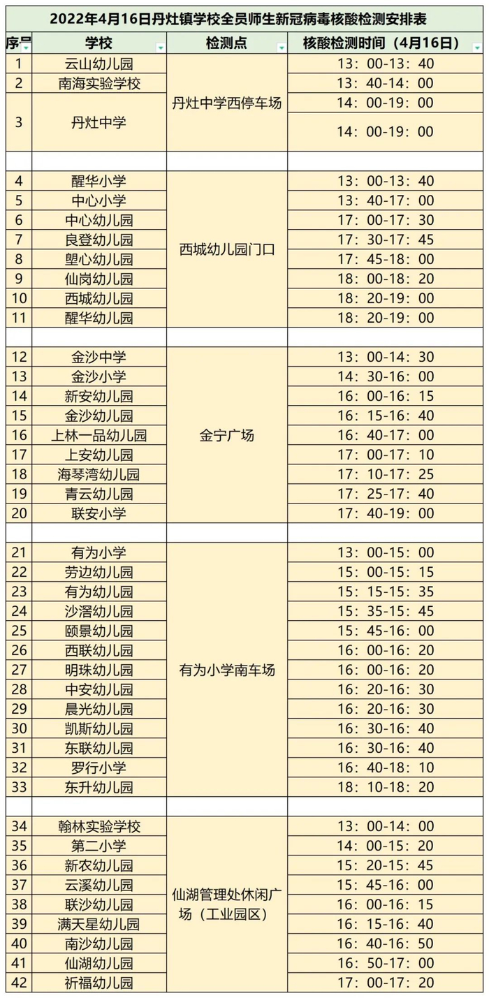 (一)4月16日13:00-19:00,全镇提供5个核酸采样专场给师生员工,具体安排请看附件“丹灶镇学校全员师生新冠病毒核酸检测安排表”。